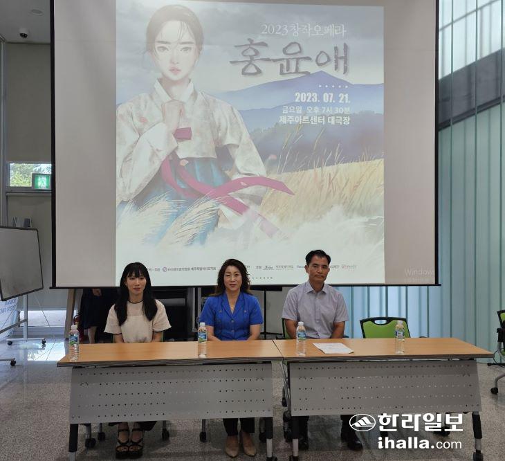 12일 제주아트센터 세미나실에서 제주음협과 제주아트센터가 공동기획한 '2023 창작오페라 홍윤애' 기자간담회가 열렸다. 사진 왼쪽부터 주인공 '홍윤애' 역을 맡은 소프라노 정혜민 씨, 제주음협 오능희 지회장, 대본과 작곡을 맡은 홍요섭 씨. 오은지기자