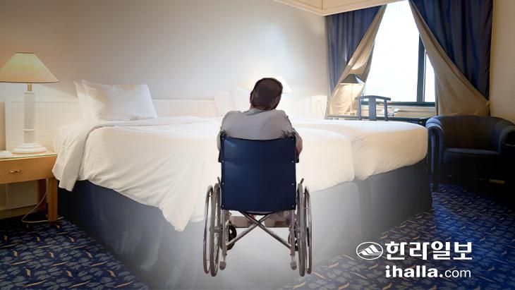 "장애인 객실 1곳이 있다"는 B호텔(100객실 이상)은 "(휠체어를 타면) 객실 내부 이동이 불편할 수 있다. 휠체어 크기가 클 경우 객실 입구 또는 복도에 세워 두면 된다"고 했다.