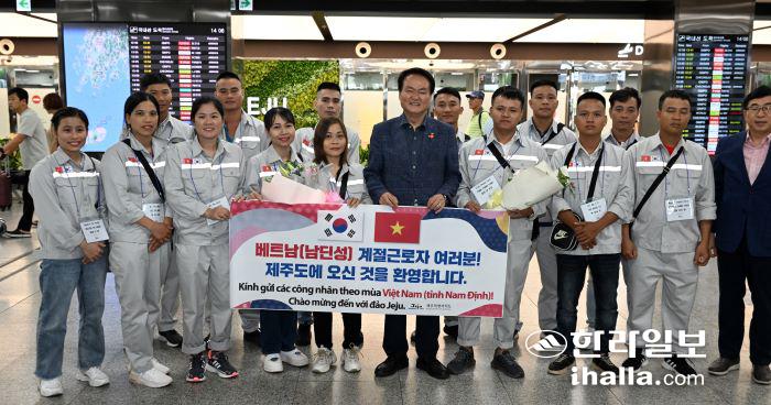 제주도는 제주공항에 입국한 계절근로자들을 맞이하기 위해 환영행사를 개최했다. 행사에 참석한 김희현 정무부지사는 계절근로자들을 환영하며 "남딘성의 우수한 근로자들 덕분에 농촌 인력난 해소 등 제주 농업 발전에 큰 도움이 될 것으로 기대한다"면서 "계절근로자들이 제주생활에 불편함이 없도록 세심하게 살피겠다"고 말했다.
