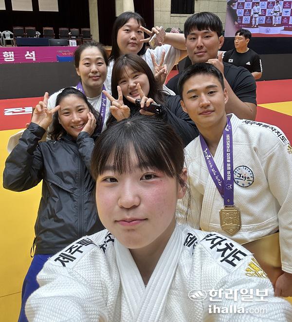 제주특별자치도청 유도선수단. 앞에서 부터 시계 반대방향으로 이경하, 김재현, 최민철, 조은나라, 차민지, 김미리, 채윤지.