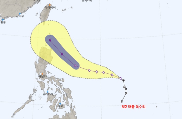 21일 기상청에 따르면 제5호 태풍 '독수리'는 이날 오전 9시 필리핀 마닐라 동쪽 1300km 부근 해상에서 발생, 시속 11km의 속도로 서북서진하고 있다. 중심기압은 1002hPa, 중심 최대 풍속 18m/s로 아직까지는 태풍 초기 수준이다.
