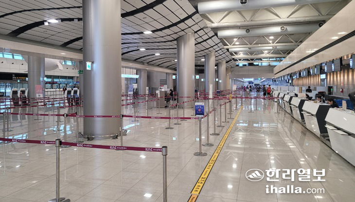 | 태풍 '카눈'의 영향으로 9일 오후 6시부터 운항 예정이던 제주 기점 항공편이 전면 결항하면서 제주국제공항이 텅 비어 있다. 박소정기자 |