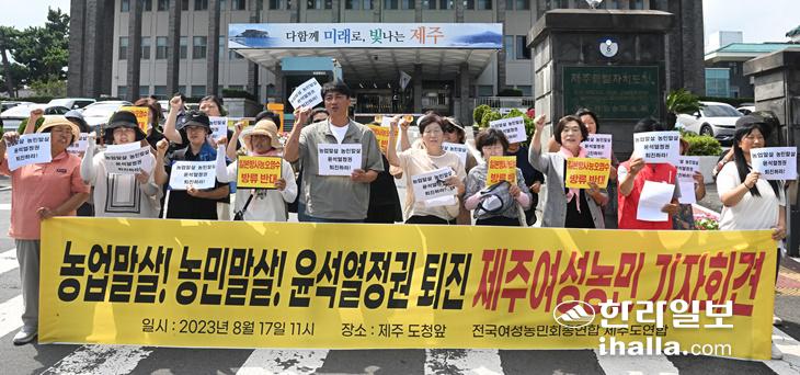 전국여성농민회총연합 제주도연합은 17일 제주도청 앞에서 기자회견을 열고 "농업농민 말살하는 윤석열 정권은 퇴진하라"고 촉구했다.