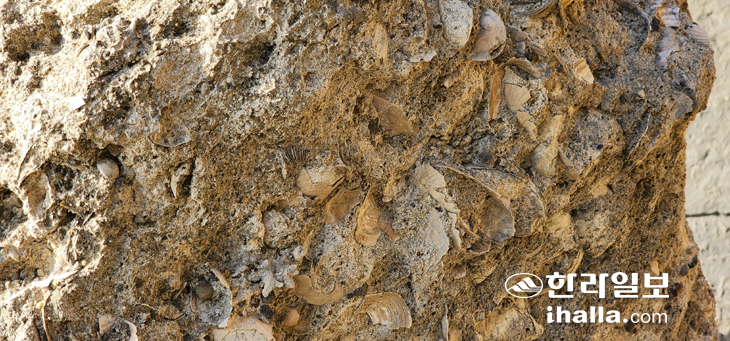 | 서귀포층에는 바위에 켜켜이 조개껍데기들이 겹쳐 있는 것도 많다. 산호 화석도 보인다. |