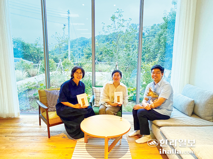 | 김용선 위원(왼쪽)이 8월 책읽는 가족으로 부부 건축가 강정윤·이창규씨를 만났다. 서귀포시민의책읽기위원회 제공 |
