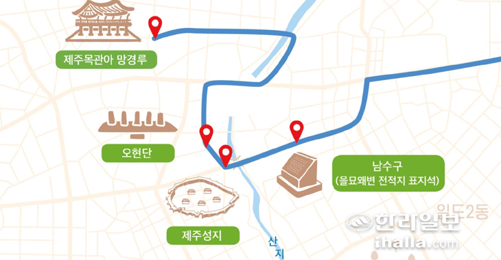 [한라일보] 화북포구, 별도연대, 별도환해장성, 큰이물(동선창), 해신사, 화북진성, 곤을동환해장성, 곤을동 4·3유적지, 사라봉수, 남수각 을묘왜변 전적지 표지석, 제주성지, 오현단, 제주목 관아 망경루. 제주시 화북동에서 삼도2동 제주목 관아까지 약 6㎞에 이르는 거리를 지나치는 동안 마주하게 될 역사적 장소들이다. 이곳을 관통하는 주요 키워드는 을묘왜변 제주대첩으로 직간접적으로 460여 년 전 이 섬에서 벌어진 사건들과 연관되어 있다. 제주도와 제주연구원이 '함께 걷는 치마돌격대 역사기행'이란 이름으로 이들 제주대첩 관련 장소를 스토리텔링으로 연결했던 때가 2021년 12월이다. 이에 더해 운주당지구 역사공원이 조성되는 등 제주대첩과 관련된 공간들이 늘고 있어서 이를 발판 삼아 대중 교육, 기념사업 등으로 확산하는 작업이 뒤따라야 한다.