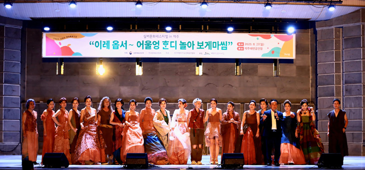 제주문화원연합회는 무더위가 한풀 꺾인 지난 27일 제주시 탑동해변공연장에서 문화로 청춘 2023년 실버문화페스티벌 '이레 옵써~ 어울엉 한디 놀아보게 마씸'이란 야심찬 제주어 주제로 행사를 진행했다.