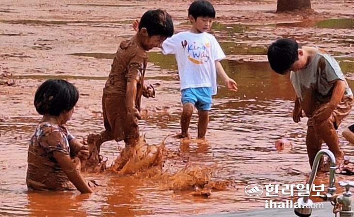 황토 어싱 광장을 찾은 아이들이 흙 놀이를 하고 있다. 서귀포시 제공