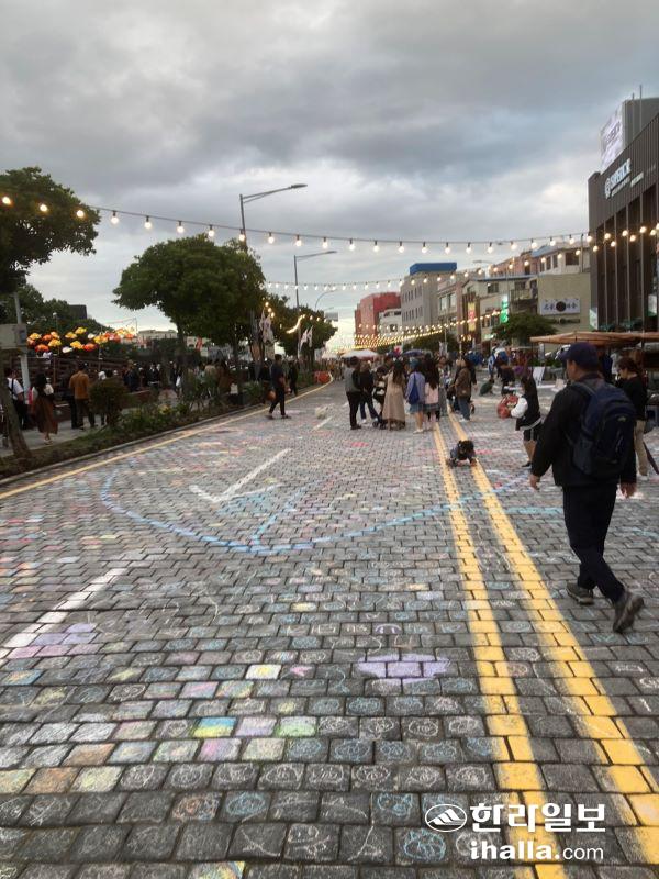 동문로터리부터 용진교까지 차가 멈춰선 '차 없는 거리'엔 플리마켓과 버스킹 등 다채로운 볼거리와 즐길거리로 가득한 탐라난장이 펼쳐졌고, 일부 구간에선 바닥 그림그리기도 진행돼 도로를 도화지 삼은 아이들과 방문객들이 크레파스로 마음껏 그림을 그리며 특별한 추억을 쌓았다.