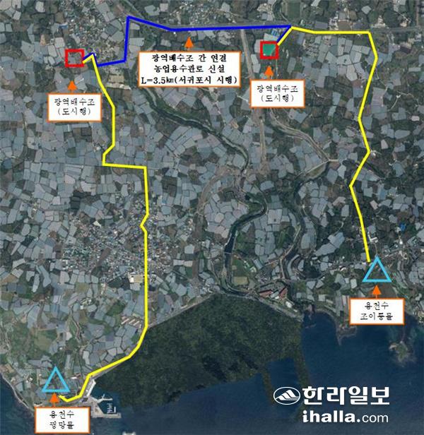 이와 관련 서귀포시는 올해 하반기부터 세부 설계를 위한 실시설계 용역에 나선다. 사업 완료 기간은 2024년이다. 서귀포시는 "광역 배수조 간 농업용수 관로 신설로 농업용수 부족으로 인한 영농 불편이 해소될 것으로 본다"고 했다.