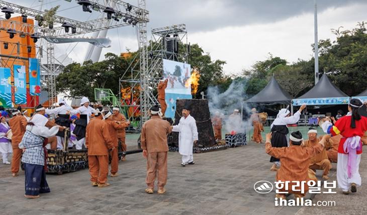 [한라일보]제주월드컵경기장 광장에서 열린 제29회 서귀포칠십리축제 칠십리 마을문화예술제에서 무쇠솥 만드는 방식을 공연으로 제작한 안덕면 덕수리민속보존회의 '삶을 짓는 솥 만들기'가 최우수상을 수상했다.