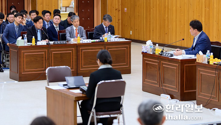 | 18일 제주도의회 농수축경제위원회가 서귀포시를 상대로 진행한 현지 행정사무감사에서 의원들이 이종우 서귀포시장에게 정책 질의를 하고 있다. 서귀포시 제공 |
