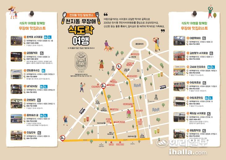 25일 천지동에 따르면 이번 지도에는 '천지동 무장애 식도락 여행'이란 이름을 달고 먹거리 골목인 아랑조을거리의 '무장애 맛집 리스트'를 차례로 소개했다. 앞서 열거한 다섯 곳 외에 중화요리 궁, 천일만두, 대윤흑돼지, 김밥명가 서귀포점, 고씨네 천지국수, 아랑회초밥, 아랑조은맛집, 육도담 서귀포점, 유림향막창 등 총 14곳을 실었다. 지난 5~6월 관련 자료를 수집한 뒤 지난달 휠체어 장애인들이 참여해 현장을 돌며 주 출입구의 접근 가능성을 기준으로 발굴한 곳이다. 지도에는 주소와 연락처는 물론 출입구 경사로와 폭, 테이블 높이, 동행자 도움 필요 여부 등을 담았다.
