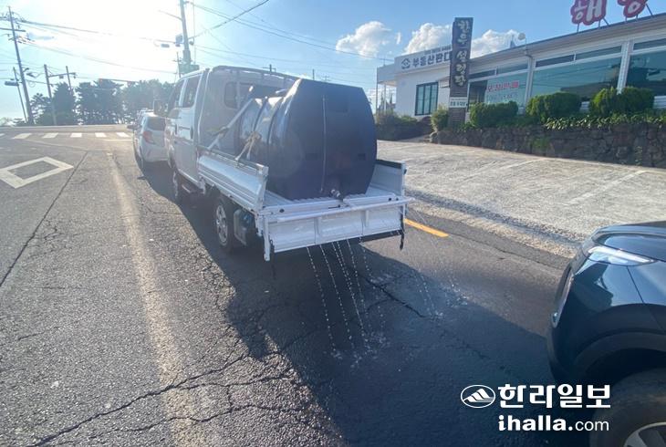 서귀포시 예래동주민센터에서 지난 1일 빙판길에 염화칼슘 제설제 대신 염수를 분사하는 제설 작업 시연을 하고 있다. 이날 시연에는 염수 대신 물을 사용했다. 예래동 제공