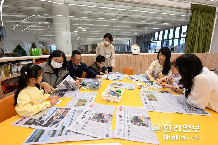 | 12일 별이 내리는 숲(3·4층)에서 진행된 '2023 JDC와 함께하는 미디어 체험데이'에서 부모와 자녀가 함께 '신문 기사로 그림책을 만들어요' 체험 프로그램에 참여하고 있다. 오은지기자 |