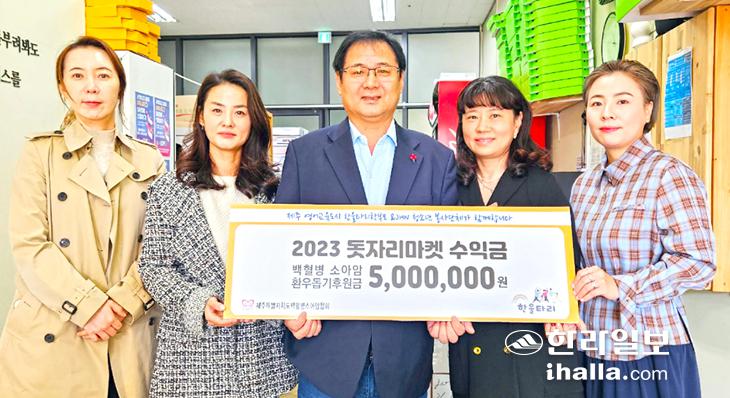 제주국제학교 학부모 봉사단체인 한울타리(공동대표 송은경·정민선)는 15일 사단법인 제주특별자치도백혈병소아암협회(협회장 손태일)에 백혈병 소아암 및 희귀난치병 환아들을 돕기 위한 '2023 돗자리마켓' 수익금 500만원을 전달했다.