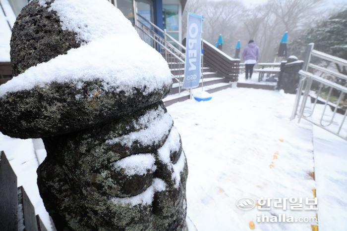 산간지역에는 대설경보가 발효중이며 제주기상청은 18일까지 5~10㎝, 많은 곳은 15㎝ 이상 많은 눈이 쌓이겠다고 예보했다.