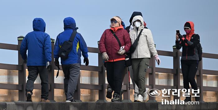 찬 공기가 내려오고 찬 바람까지 불고 있는 제주지방은 18일 오후부터 점차 평년기온을 회복, 19일에는 대체로 맑고 낮 최고기온은 16~19℃를 보일 것으로 전망된다. 18일 오전 찬 바람 속에서도 제주시 도두동 해안을 걷고 있는 관광객들. 강희만 기자