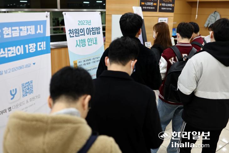 천원의 아침밥을 이용하는 대학생들. 한라일보DB