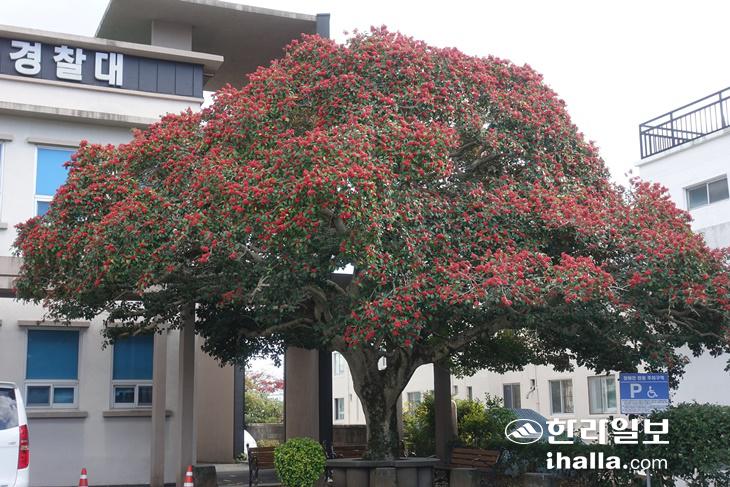 서귀면사무소가 있던 서귀포자치경찰대 건물 입구에 자라는 먼나무. 진선희기자