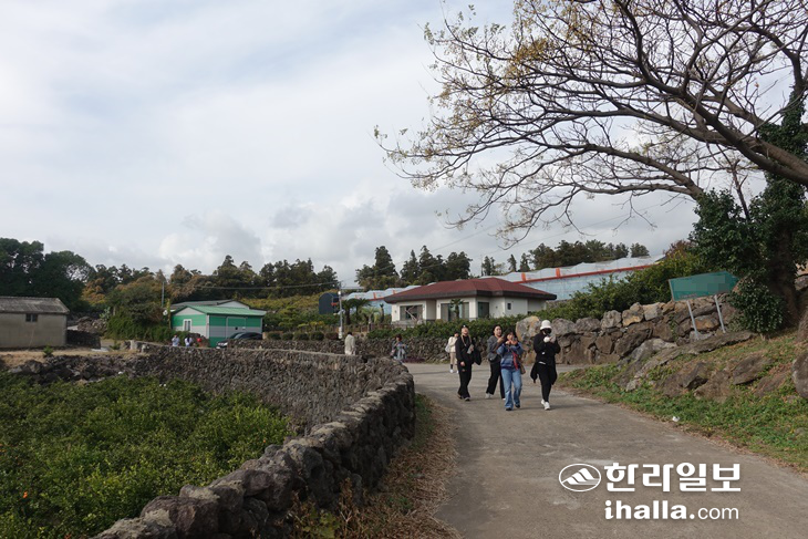 | 참가자들이 노오란 감귤밭과 검은 돌담이 어울린 마을 안길을 걷고 있다. |