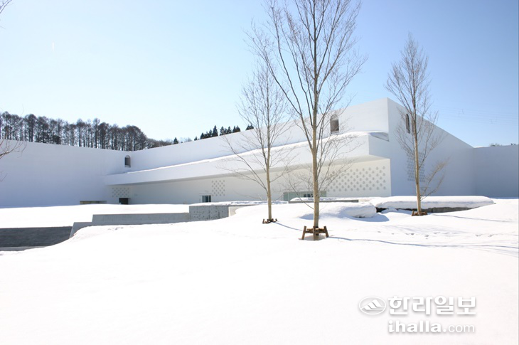 처음 향한 곳은 아오모리시에 있는 '아오모리 현립미술관'. 흰 눈으로 뒤덮힌 나무 숲 사이에 덩그러니 서있는 순백의 건물이 시선을 사로잡았다. 지하 2층, 지상 2층 규모의 이 건물은 일본의 유명 건축가 '아오키 준'이 미술관 인근에 있는 조몬시대(신석기시대) 대규모 취락지인 '산나이 마루야마 유적' 발굴 현장에서 영감을 얻어 설계했다고 한다. 지면을 마치 유적 발굴 현장처럼 땅속 깊게 파내고 그 위에 흰 벽돌로 만든 구조물을 엇갈리듯 연출한 독특한 구조였는데, 과거와 현재가 공존하는 이 공간은 주변 경치와 어우러져 운치를 더해줬다.