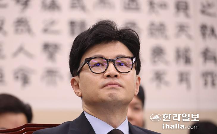 19일 국회에서 열린 법제사법위원회 전체회의에 출석한 한동훈 법무장관이 안경을 어딘가를 바라보고 있다. 연합뉴스