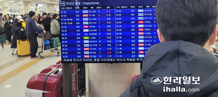 | 22일 제주공항 3층 출발장에서 한 승객이 결항, 지연이 표시된 항공 운항 안내판을 바라보고 있다. 박소정기자 |