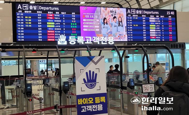 22일 오후 제주공항에 설치된 항공 운항 안내판이 탑승 수속을 알리고 있다.
