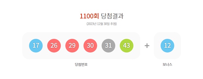 동행복권에 따르면 30일 제1100회 로또 추첨에서 1등 당첨번호로 '17, 26, 29, 30, 31, 43'이 뽑혔다. 2등 보너스 번호는 '12'이다.