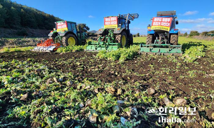 제주월동무연합회(회장 강동만)은 15일 서귀포시 성산읍 난산리 월동무 밭에서 트랙터 3대를 동원, 3필지 8000여 ㎡를 모두 갈아엎었다.