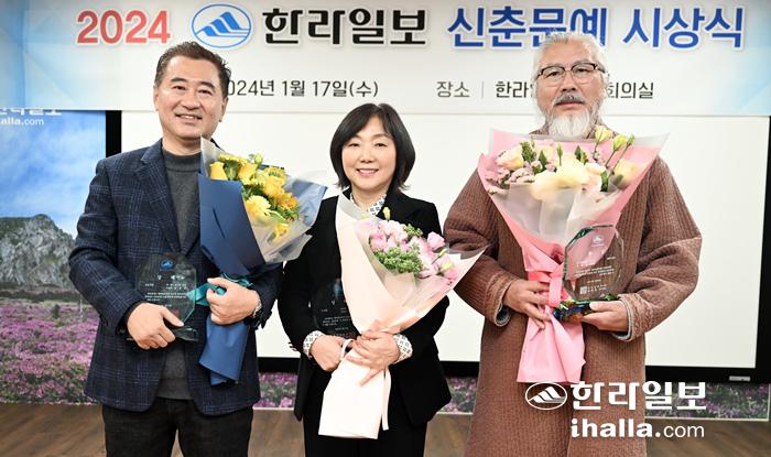 17일 한라일보 3층 회의실에서 '2024 한라일보 신춘문예' 시상식이 열렸다. 이날의 주인공은 시 '둥근 물집'으로 당선한 우정인 시인을 비롯 가작에 선정된 시조 '민달팽이 길'의 천윤우 시조시인과 소설 '상구와 상순'의 윤호준 소설가였다.