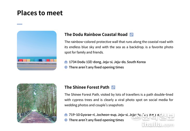 이밖에도 최근 제주를 배경으로 제작된 드라마 '웰컴투삼달리'의 촬영 장소와 주변 관광 콘텐츠를 비짓제주 외국어 페이지와 해외 SNS를 통해 소개해 호응을 얻고 있다고 제주관광공사는 전했다.