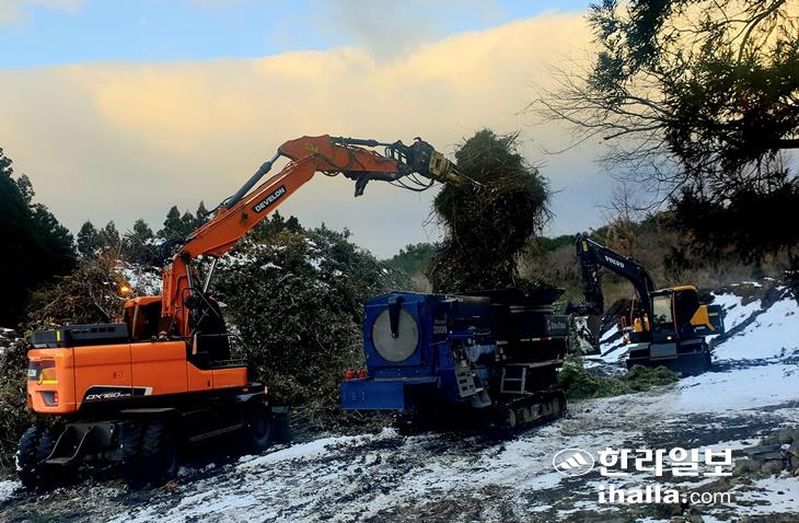 서귀포시가 가로수 전정 등으로 발생하는 목재 부산물을 파쇄하고 있다. 서귀포시 제공