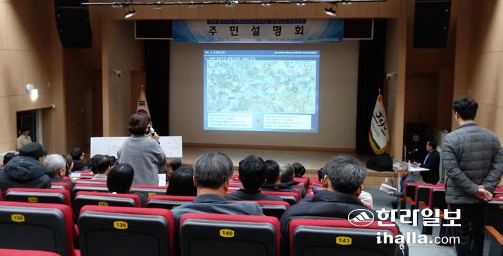 31일 오후 서귀포시청 별관 문화강좌실에서 서귀포여중~삼성여고 구간 '제주 일주도로 우회도로' 기본설계안 주민 설명회가 열리고 있다. 진선희기자