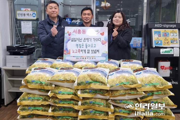 지난 2일 설 명절을 앞두고 '노고록 아저씨'가 또다시 서귀포시 서홍동에 쌀 100포를 배달했다. 올해로 25년째다. 서홍동 제공