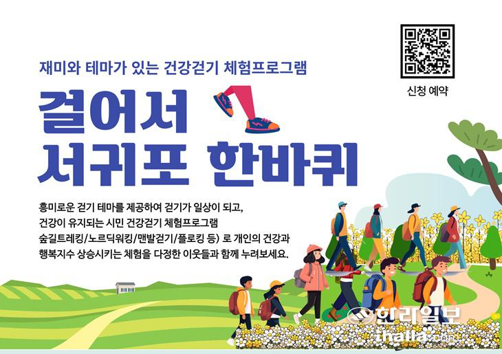 [한라일보] 서귀포시 3개 보건소가 전국 최하위권에 속하는 시민들의 '걷기 실천율'을 높이기 위해 내달부터 '재미와 테마가 있는 건강 걷기 체험 프로그램'을 운영한다. '걸어서 서귀포 한 바퀴'란 이름 아래 서귀포시걷기협회(회장 조훈배) 주관으로 서귀포시 구석구석 숨겨진 걷는 길 코스 등을 직접 두 발로 디디며 건강까지 챙기도록 이끈다.