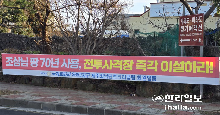 | 대정읍 일대에 걸린 사격장 보강 공사 반대 현수막 중 하나. |