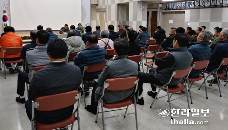 해병대 제9여단 주관으로 27일 오후 대정읍사무소에서 사격장 보강 공사 주민 설명회가 열리고 있다. 진선희기자