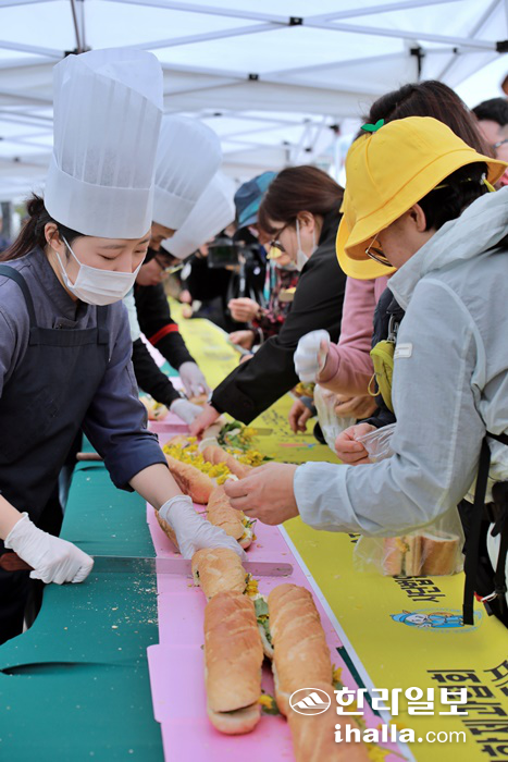 | 제26회 서귀포 유채꽃 국제 걷기 대회 첫날 26회 대회 개최를 기념해 만든 길이 26m의 대형 유채꽃 샐러드빵 시식 체험이 이루어지고 있다. 서귀포시 제공 |