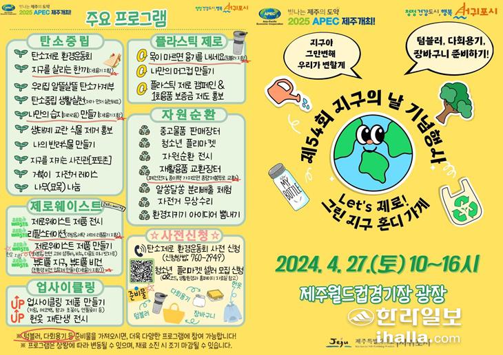 [한라일보] 제54회 지구의 날(4월 22일)을 맞아 제주 서귀포시에서 기후 위기 극복을 위한 행사가 열린다. 서귀포시와 서귀포시 지속가능발전협의회(회장 오창순), 서귀포시 새마을부녀회(회장 나성순)가 오는 27일 월드컵경기장 광장에서 펼치는 '레츠 제로! 그린 지구 혼디 가게' 주제 축제다.