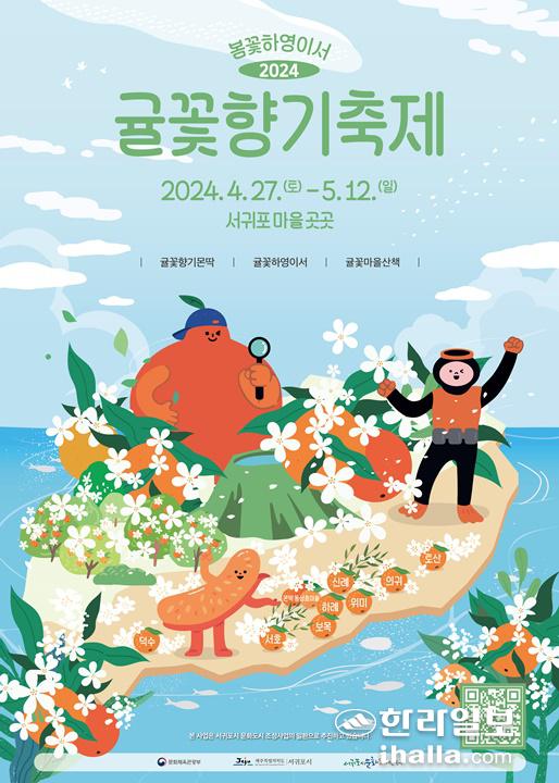 [한라일보]제주 서귀포의 봄날엔 감귤꽃이 있다. 귤꽃 향기가 서귀포 곳곳에 퍼지고 난 뒤 여름 지나 늦가을이 되면 비로소 노지 감귤이 주홍빛으로 익는다. 서귀포시와 서귀포시문화도시센터가 감귤과는 또 다른 풍경을 그려내는 하얀 감귤꽃과 함께하는 릴레이 형식의 마을 축제를 펼친다. 이달 27일 막이 올라 5월 12일까지 이어지는 '2024 봄꽃하영이서 귤꽃향기축제'다.