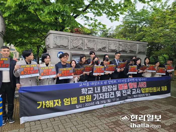 제주교사노동조합과 중등교사노동조합은 29일 제주지방법원앞에서 학교 내 화장실 불법촬영 사건 가해자 엄벌 탄원을 위한 기자회견을 개최했다.
