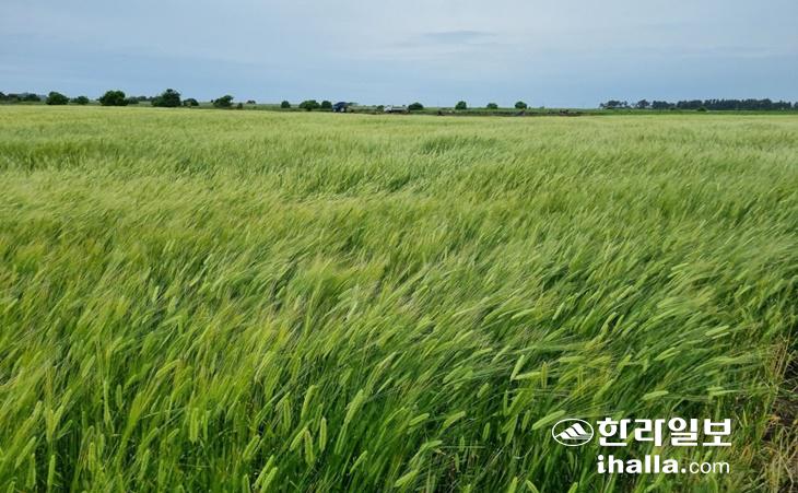 대정읍 농지에서 '밭작물 토양생태환경보전사업'으로 재배 중인 녹비용 보리. 서귀포시 제공