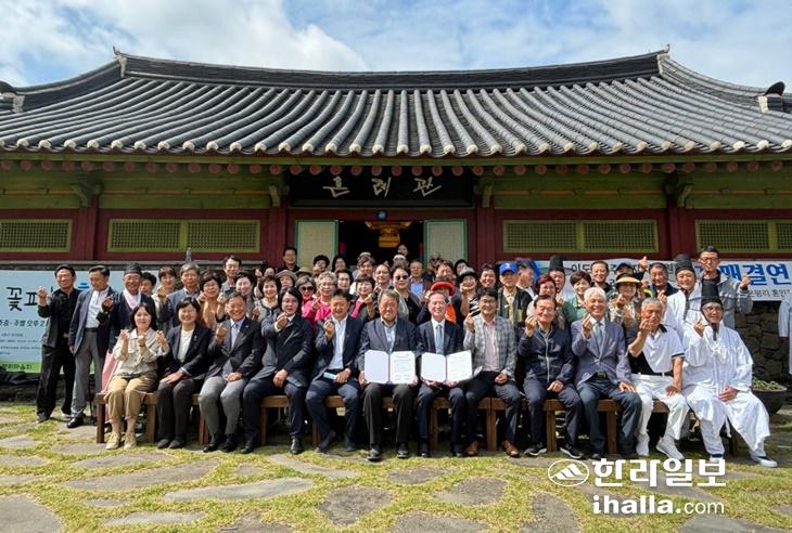 서귀포시 성산읍 온평리 혼인지에서 온평리마을회와 이도1동주민자치위원회 관계자들이 기념사진을 찍고 있다. 성산읍 제공