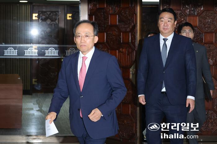 국민의힘 추경호 원내대표가 24일 오전 국회에서 비공개 의원총회를 마친 뒤 나오고 있다. 연합뉴스