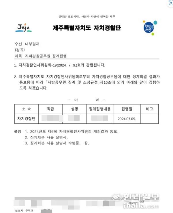 [한라일보] 제주특별자치도 자치경찰단이 경찰공무원의 징계사항과 징계내용, 징계대상자와 직급 등 개인정보를 공개해 논란이 되고 있다.
