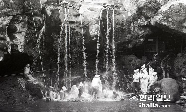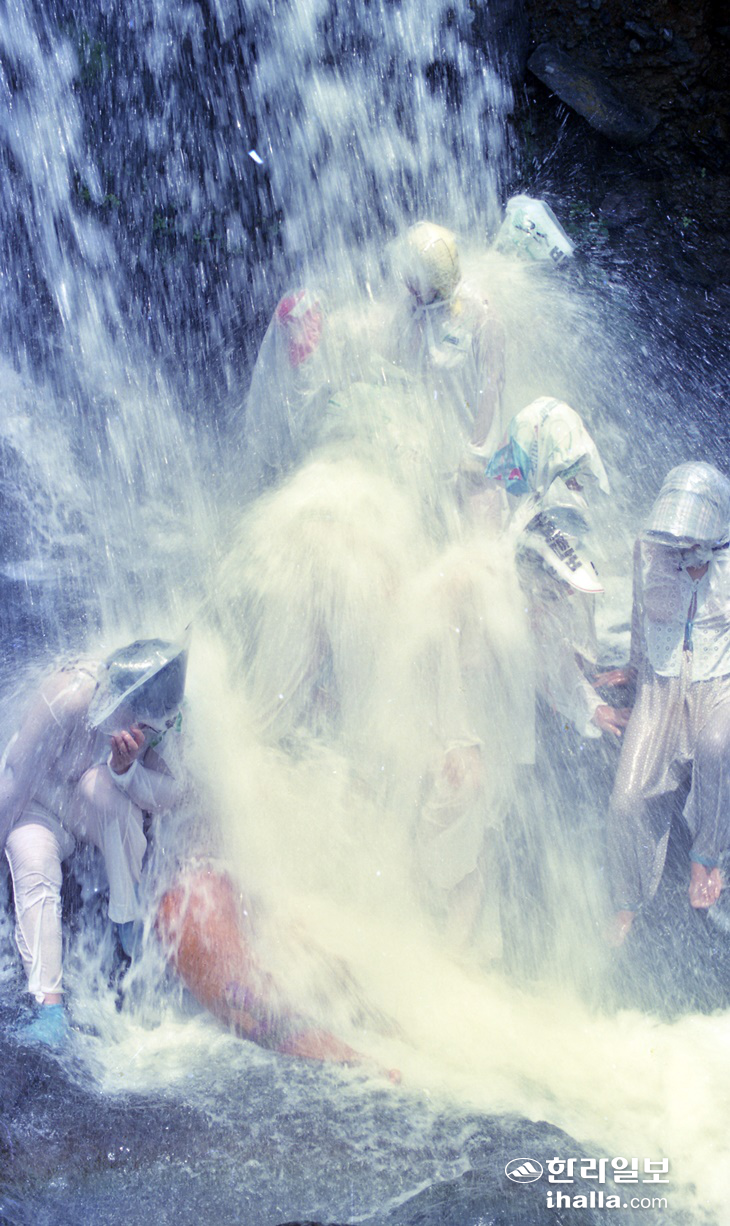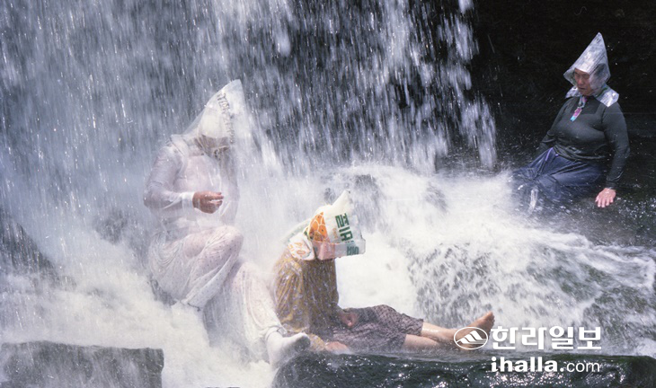[한라일보] 1989년 여름, 서귀포시 돈내코계곡입니다. 난대 상록수림이 울창한 계곡 한 가운데 자리한 높이 5m의 작은 원앙폭포에서 물줄기가 쏟아져 내립니다. 떨어지는 물줄기 아래에는 비닐포대로 만든 모자와 비닐 옷을 입은 사람들이 삼삼오오 모여 시원한 폭포수를 맞고 있습니다. 그 옆으로는 ‘물맞이’ 순서를 기다리는 사람들의 모습도 보입니다.