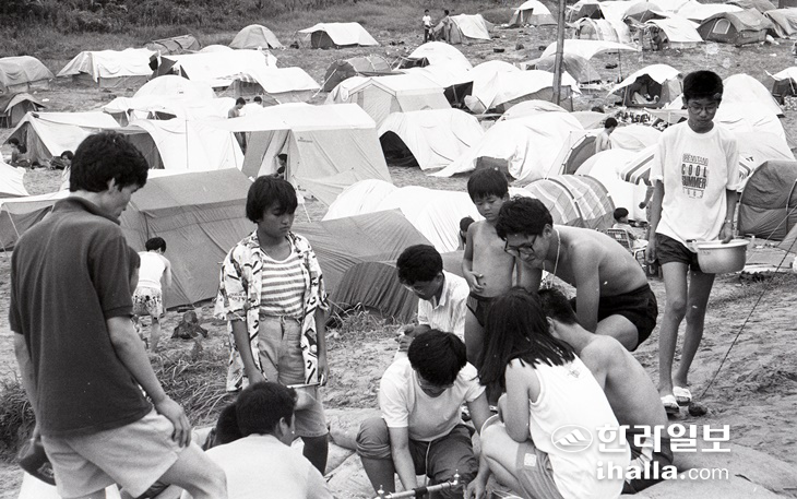 여름해양학교로 함덕해수욕장에서 캠핑하는 해양소년단 단원들(1992년)