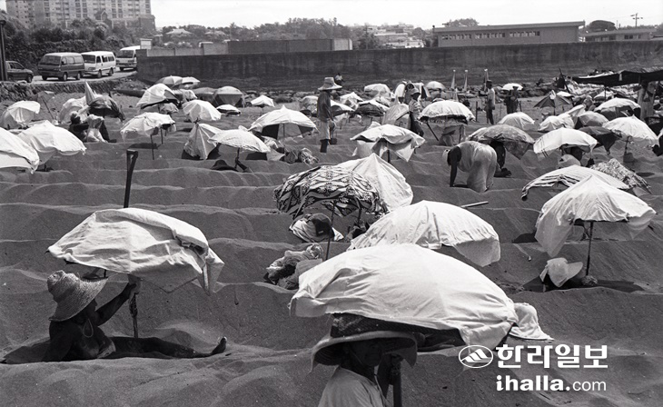 삼양해수욕장에서 뜨거운 검은 모래를 덮고 찜질하는 사람들의 풍경(1992년)